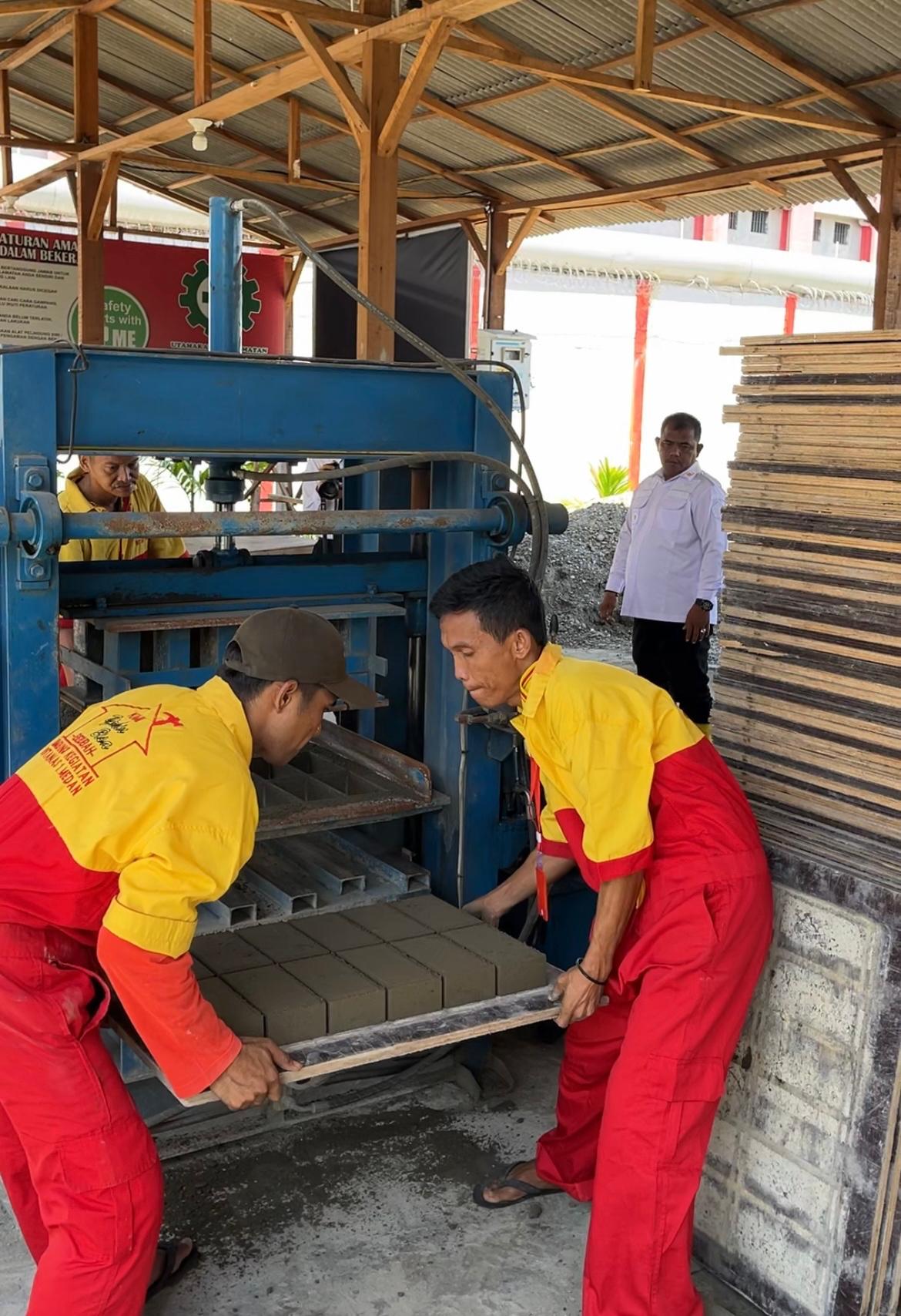 Warga binaan yang didampingi oleh petugas mencetak paving blok di dalam Rutan Medan, dan banyak dipesan dari berbagai perusahaan dan dikenal memiliki kualitas yang cukup bagus dan tahan lama.