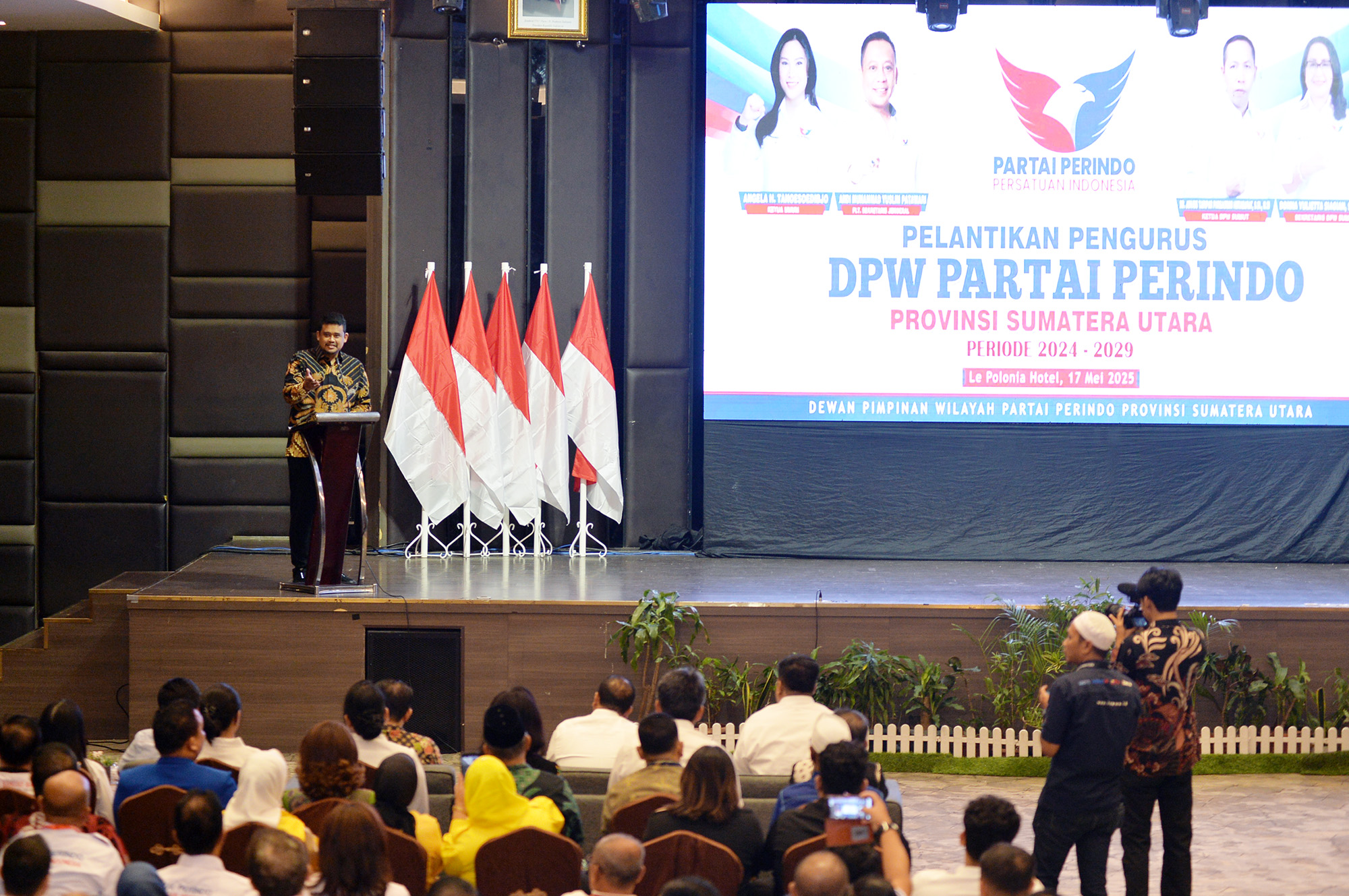 Gubernur Sumut, Bobby Nasution (kiri) saat menyampaikan sambutan pada pelantikan DPW Perindo Sumut periode 2024-2029.(Satunusantara news/HO-Diskominfo Sumut).