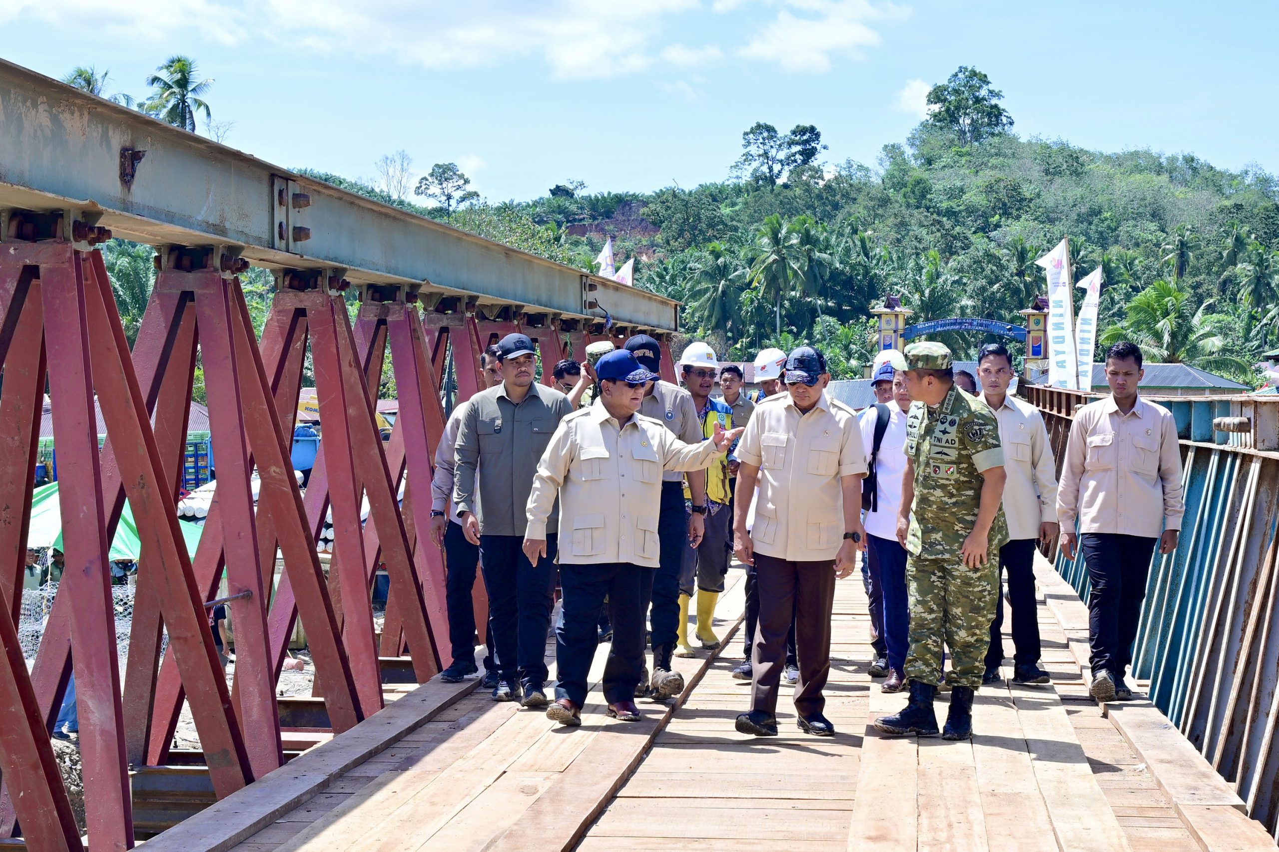 Presiden Prabowo, Rabu (31/12) melihat langsung proses pembangunan jembatan Bailey yang melintasi Sungai Garoga, sekaligus perbatasan antara Kabupaten Tapsel dengan Tapanuli Tengah (Tapteng). Jalan lintas Sumatera (Jalinsum) pantai barat tersebut, beberapa waktu lalu sudah bisa dilewati, dengan pengalihan sementara jalur di samping jembatan yang sedang dibangun.