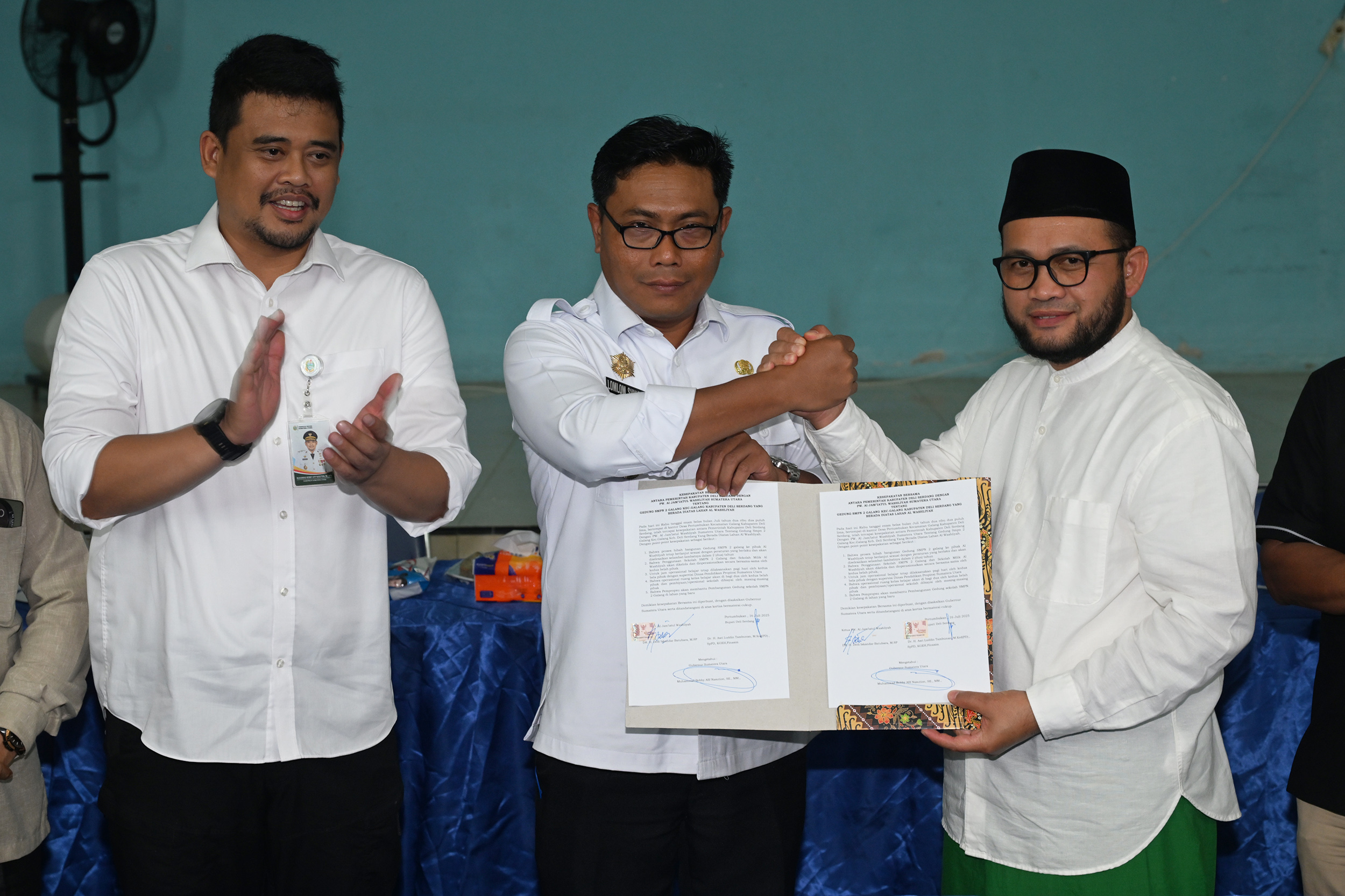 Gubernur Sumatera Utara Muhammad Bobby Afif Nasution (kiri) saat menyaksikan kesepakatan bersama antara  Pemkab Deliserdang dengan Al-Washliyah, terkait penggunaan gedung sekolah/madrasah. (Satunusantara news/HO-Diskominfo Sumut)