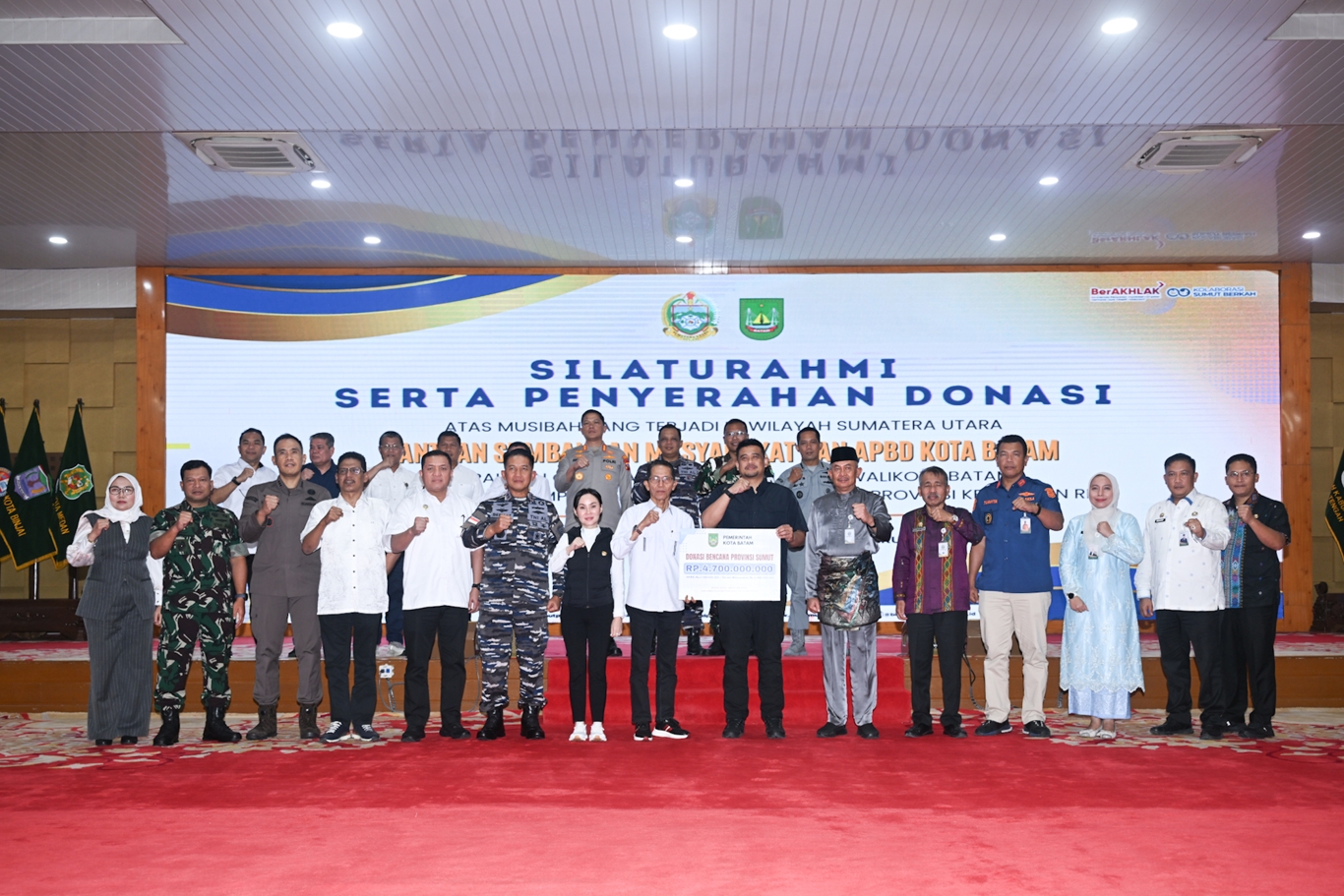 Bantuan tersebut diserahkan langsung oleh Walikota Batam Amsakar Achmad bersama Wakil Walikota Batam Li Claudia Chandra kepada Gubernur Sumut Bobby Nasution di Aula Tengku Rizal Nurdin, Jalan Sudirman Nomor 41 Medan, Kamis (8/1).Total bantuan yang diserahkan sebesar Rp 4.700.000.000, terdiri atas bantuan APBD Kota Batam sebesar Rp 2.500.000.000 dan donasi masyarakat Kota Batam sebesar Rp 2.200.000.000.