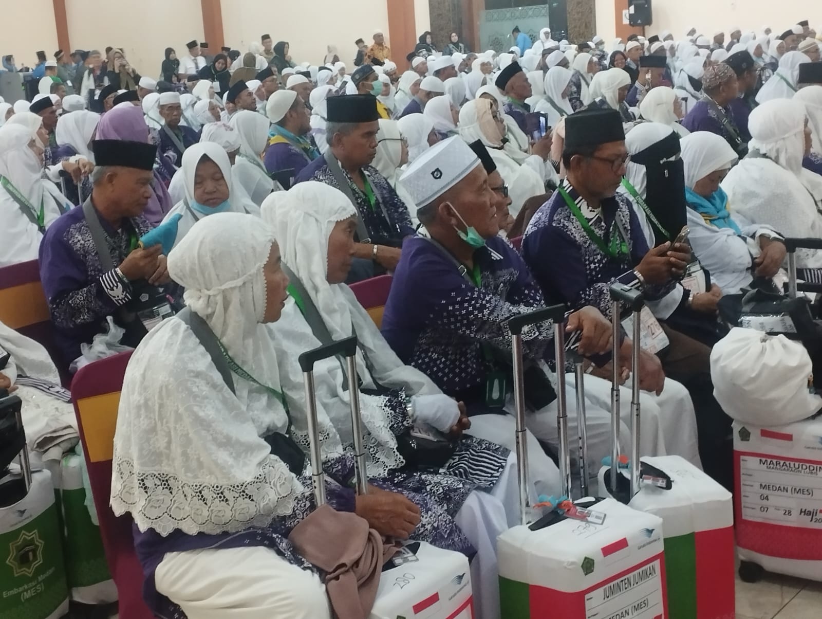 Sebanyak 359 jemaah haji dari Kloter 04 Embarkasi Medan, saat pemberangkatan ke tanah suci Mekkah dari Asrama Haji Medan.(Satunusantara news/Munawar).