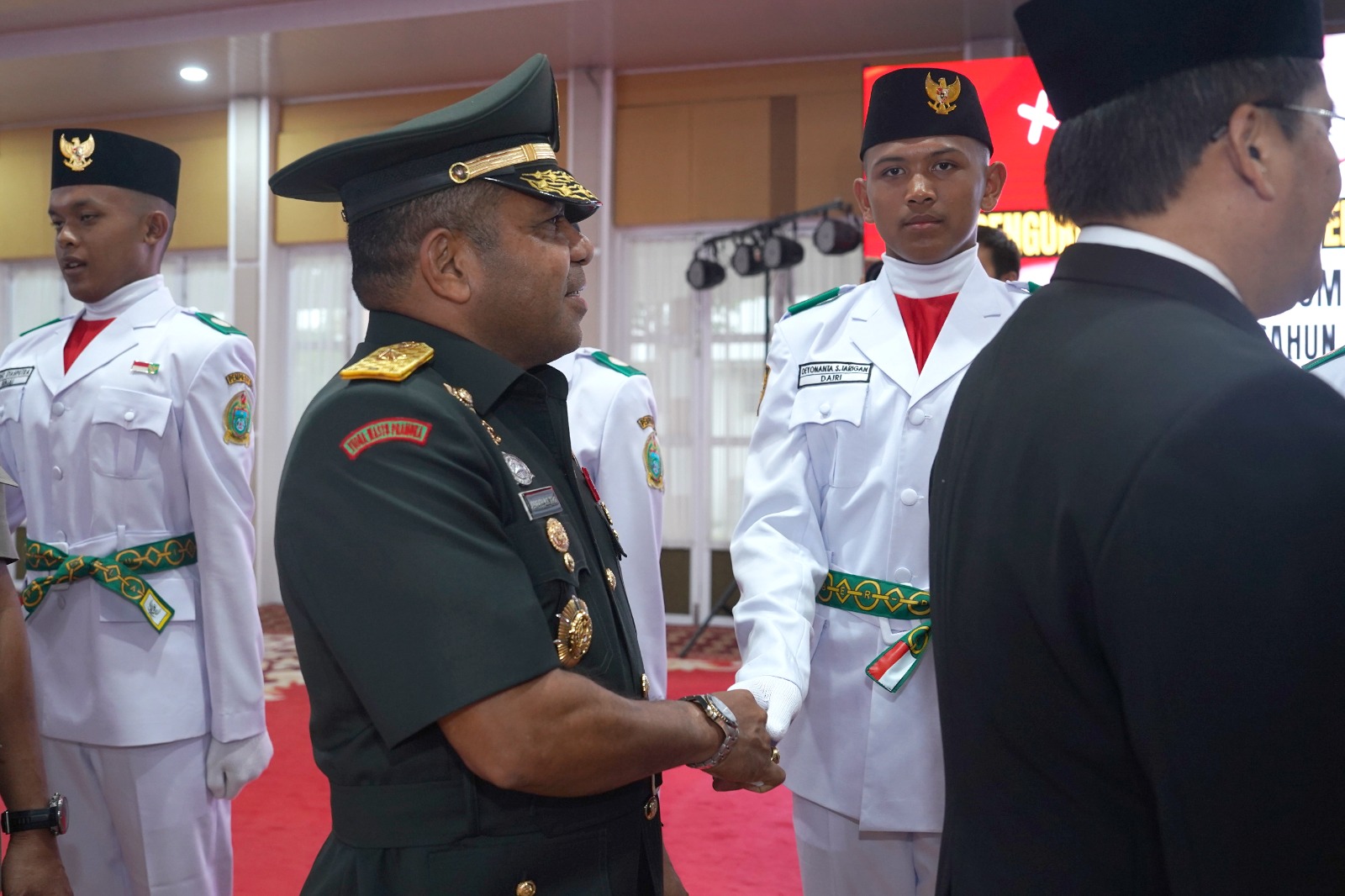 Irdam I/BB Brigjen TNI Josafath M. Robert Duka (kiri) saat menyalam anggota Paskibraka Sumut tahun 2025.(Satunusantara news/HO-Pendam I/BB).