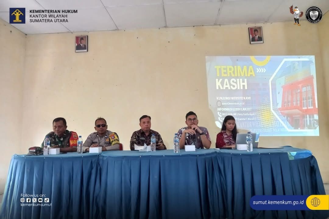 Medan (Satu Nusantara News) – Kantor Wilayah Kementerian Hukum Sumatera Utara menggelar sosialisasi dan monitoring aktualisasi Pos Bantuan Hukum , dalam Rangka Penyelenggaraan Paralegal Justice Award di Kelurahan Terjun, Kecamatan Medan Marelan, Kota Medan, Kamis (26/06).