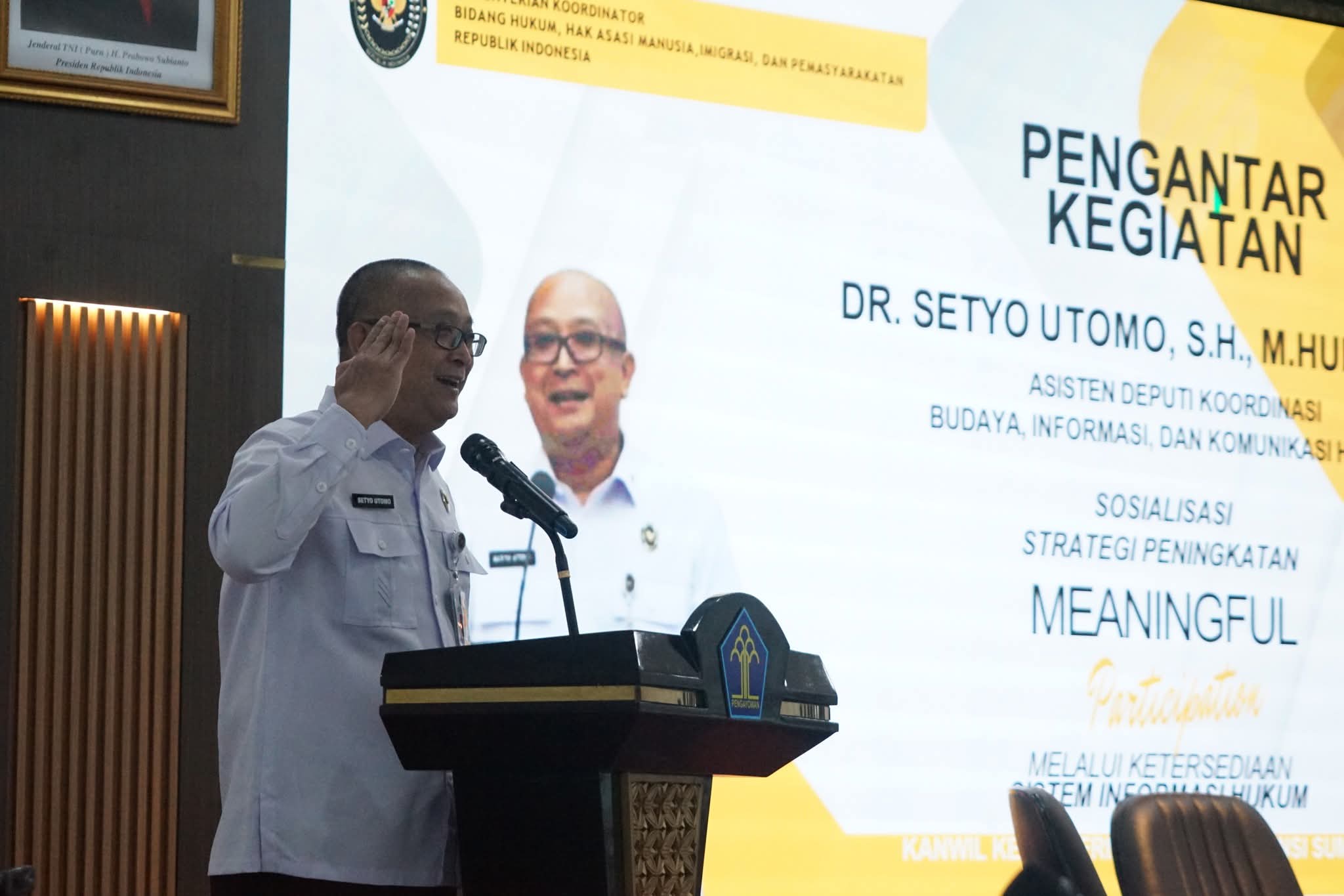 Kegiatan dibuka oleh Asisten Deputi Koordinasi Budaya, Informasi, dan Komunikasi Hukum, Setyo Utomo, dalam sambutannya yang menekankan pentingnya memperkuat partisipasi masyarakat secara bermakna dalam proses pembentukan produk hukum daerah.