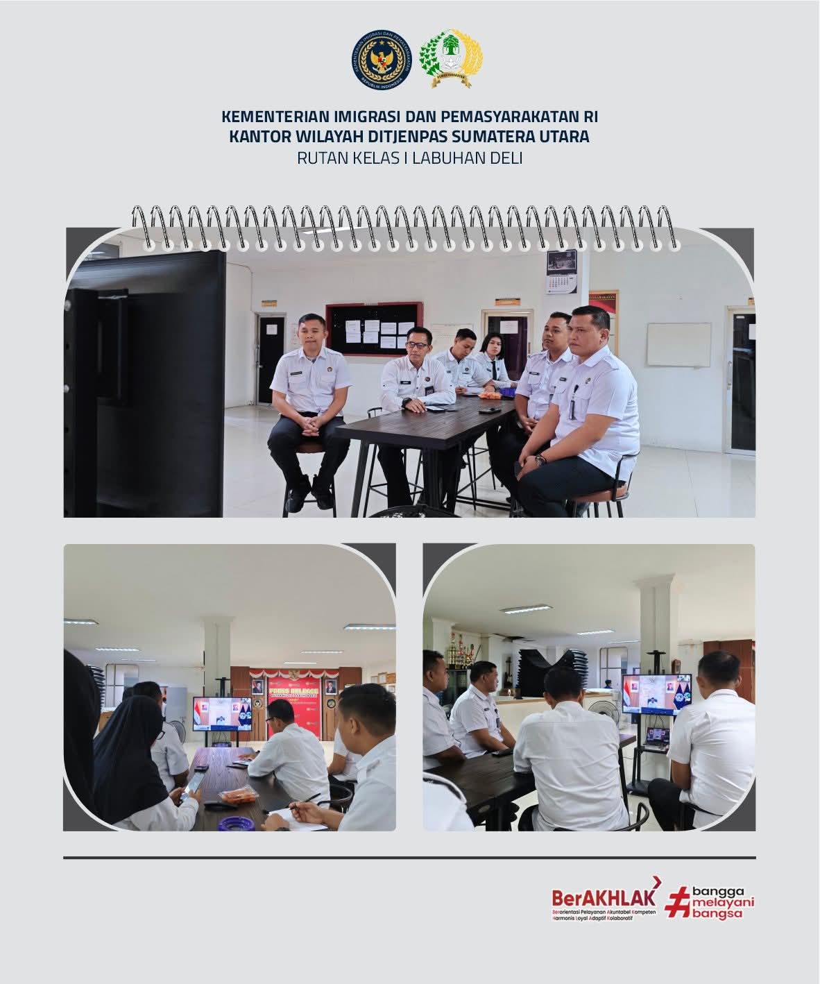 Labuhan Deli (Satu Nusantara News) – Kepala Rumah Tahanan Negara (Rutan) Kelas I Labuhan Deli, Eddy Junaedi, bersama jajaran pejabat struktural mengikuti pengarahan dari Direktur Jenderal Pemasyarakatan (DirjenPAS), Mashudi, melalui Zoom Meeting di Aula Lantai 2 Rutan Labuhan Deli, Kamis (04/09).
