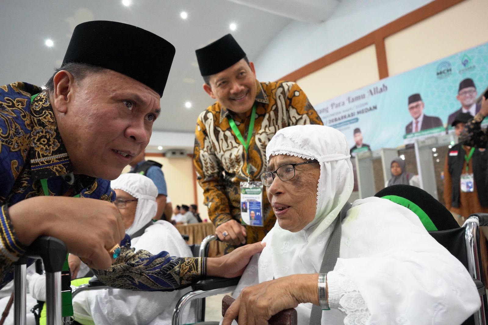 saat melepas keberangkatan jemaah calhaj Kloter 20 di Aula 1 Madinatul Hujjaj Asrama Haji Medan, Minggu malam (25/05).