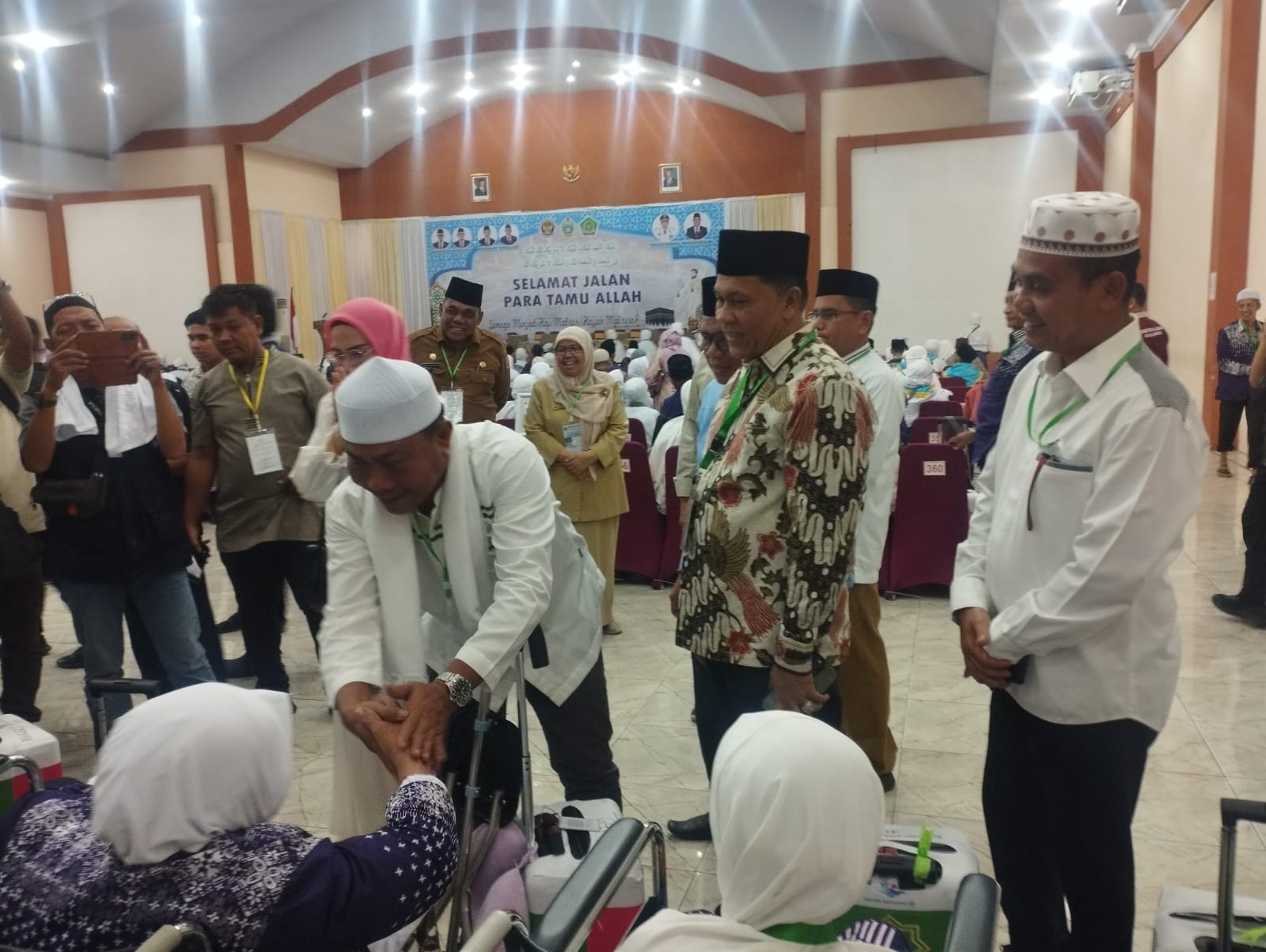 Ketua PPIH Embarkasi Medan H. Ahmad Qosbi (dua dari kanan) saat menemui dan memberi semangat  para  jemaah haji lansia yang tergabung di Kloter 04 Embarkasi Medan.(Satunusantara news/Munawar)