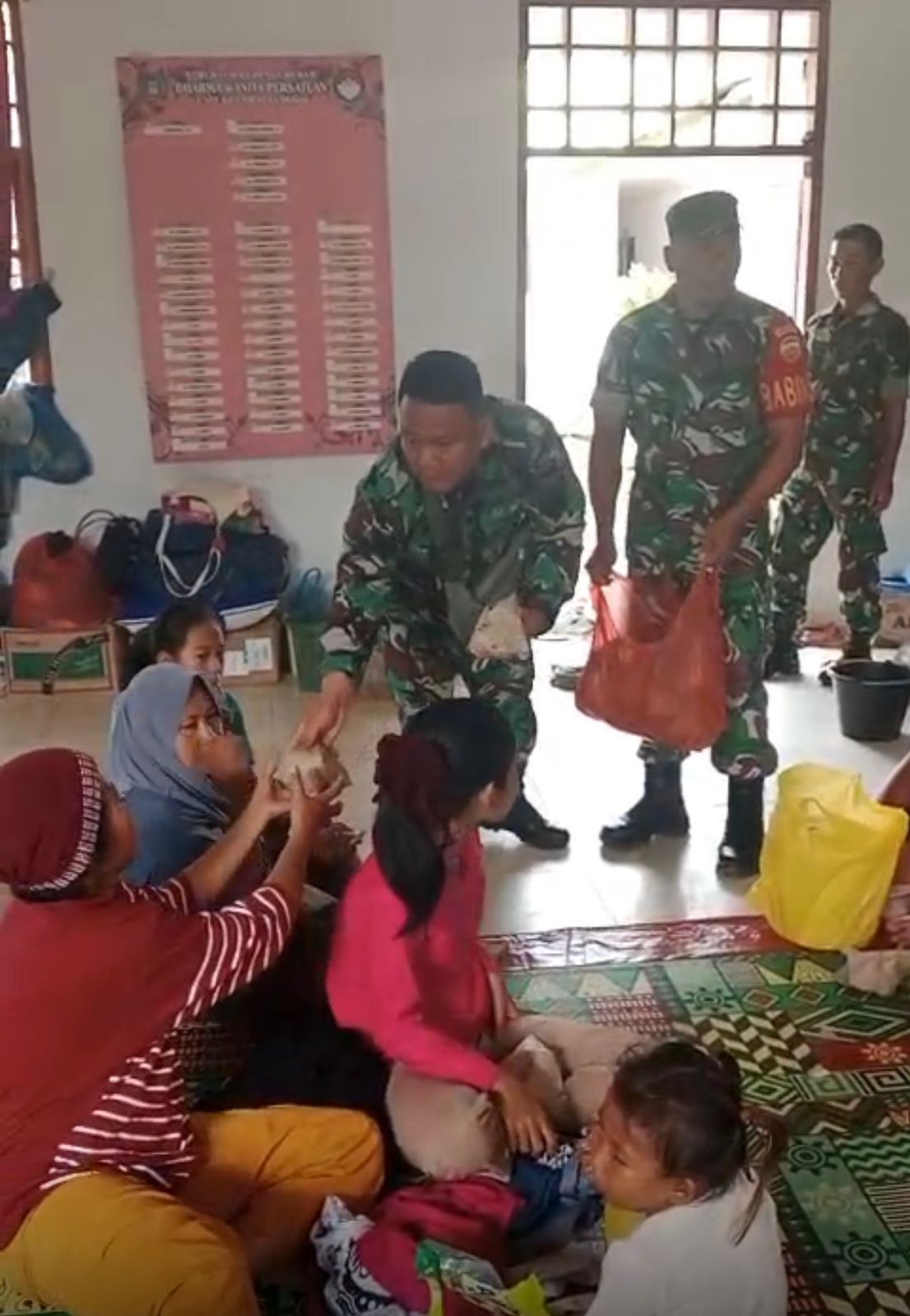 Personel Koramil 09/Hinai, saat memberikan bantuan makan kepada warga yang terdampak banjir di Kabupaten Langkat.(Satunusantara news/HO-Pendam I/BB).