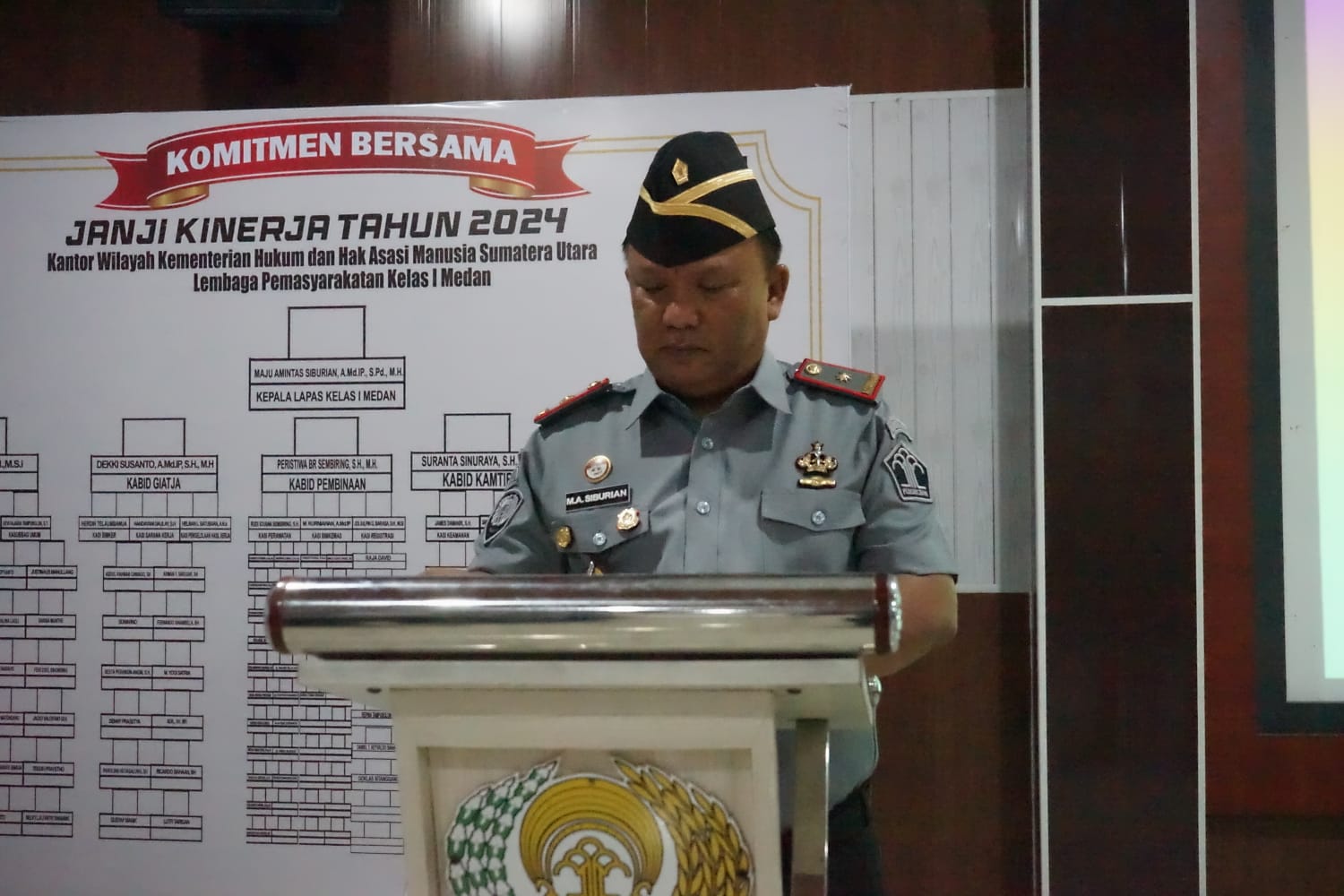 Kalapas Kelas I Medan, Maju Amintas Siburian selaku pembina apel dan Penandatanganan Komitmen Bersama & Janji Kinerja 2024, dalam sambutannya mengatakan agar tetap semangat dan komitmen petugas Lapas Kelas I Medan.