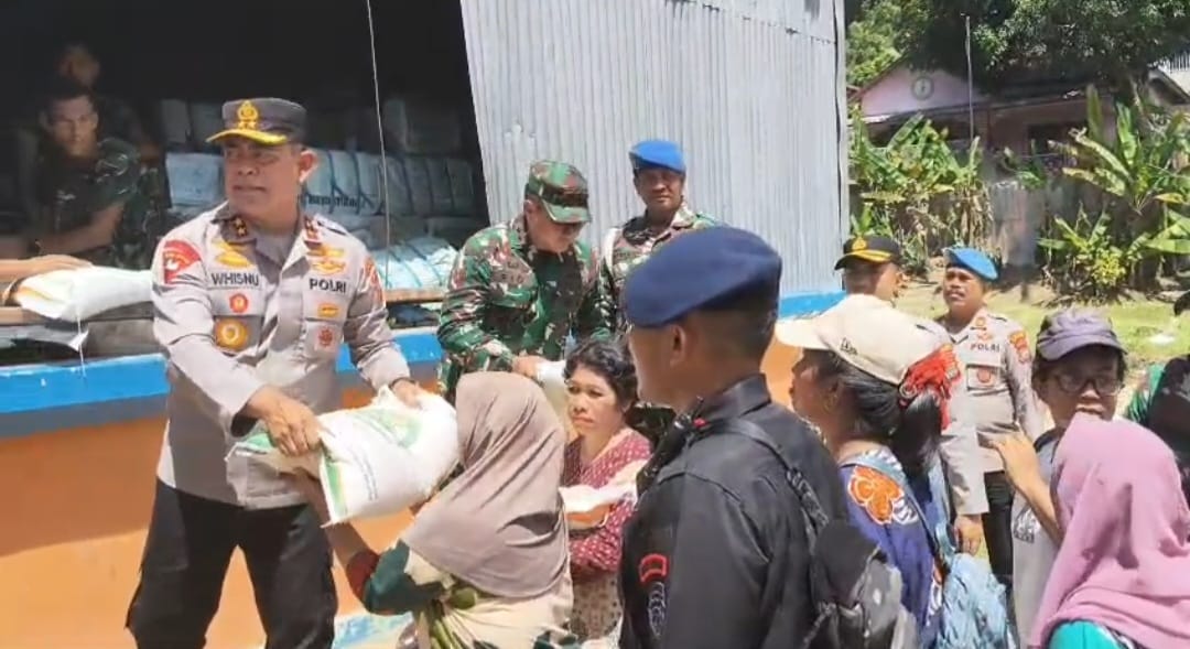 Pangdam I/BB Mayjen Rio Firdianto dan Kapolda Sumut Irjen Pol Whisnu Hermawan Februanto, ikut memantau setiap tahapan penyaluran, bahkan turun langsung membagikan beras kepada warga. Keduanya tampak berinteraksi dengan penerima bantuan sambil mengimbau masyarakat agar tetap tenang dan mengikuti pengarahan petugas demi kelancaran proses distribusi.