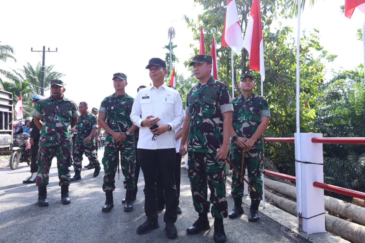 Pangdam I/BB Mayjen TNI Hendy Antariksa (dua kanan) saat  meninjau pembangunan Jembatan Aramco yang telah selesai dibangun di Dusun 3 Simpang Pondok Gudang, Desa Perkebunan Tanjung Beringin, Kecamatan Hinai, Kabupaten Langkat.(Satunusantara news/HO-Pendam I/BB)