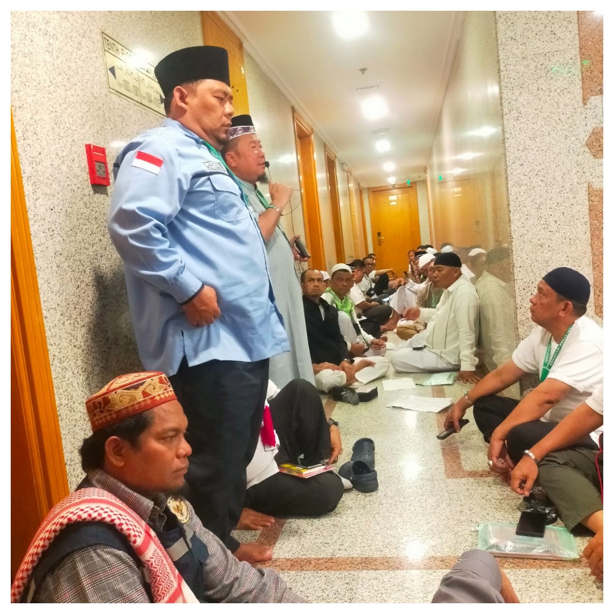 Ketua Kloter 09 Embarkasi Sumut, Muhammad Lukman Hakim Hasibuan (tengah) saat memberikan pengarahan kepada  Karu dan Karom di Hotel Shafwah Madinah.(Satunusantara news/HO-Humas PPIH Embarkasi Medan).
