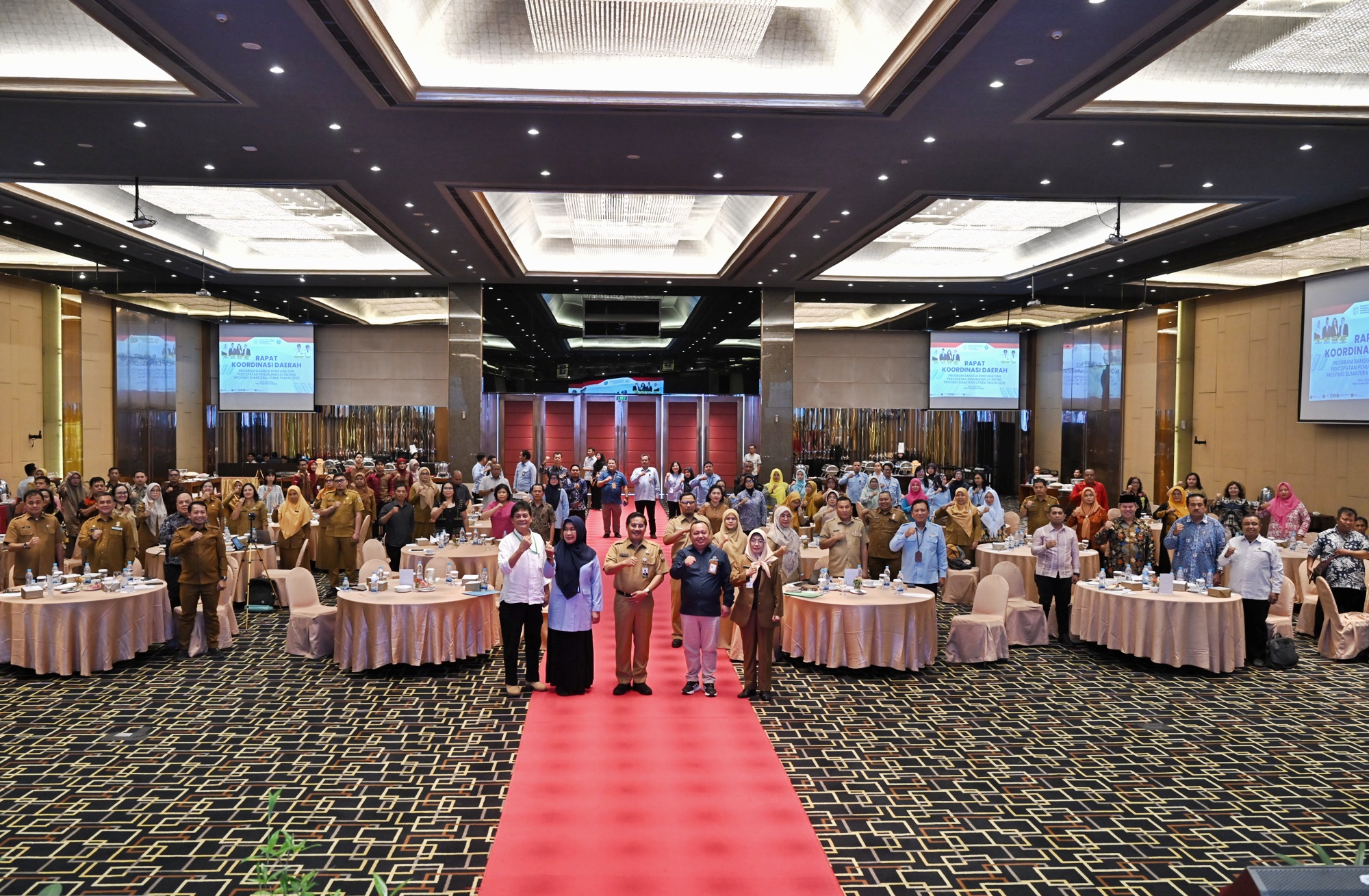 Sekdaprov Sumut Togap Simangunsong (tengah) saat foto bersama usai membuka Rakorda Program Bangga Kencana dan Percepatan Penurunan Stunting Provinsi Sumut tahun 2025.(Satunusantara news/HO-Diskominfo Sumut).