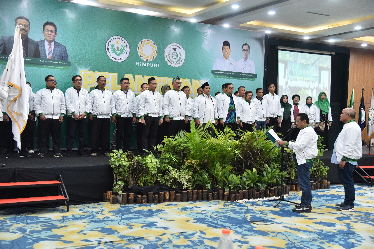 Rektor Unimed Prof. Dr. Ir. Baharuddin, ST, M.Pd, (tengah) saat melantik Pengurus Pusat Ikatan Alumni Universitas Negeri Medan (IKA UNIMED) untuk periode 2025–2029, di Hotel Grand Inna Deli Medan.(Satunusantara news/HO-Humas Unimed).