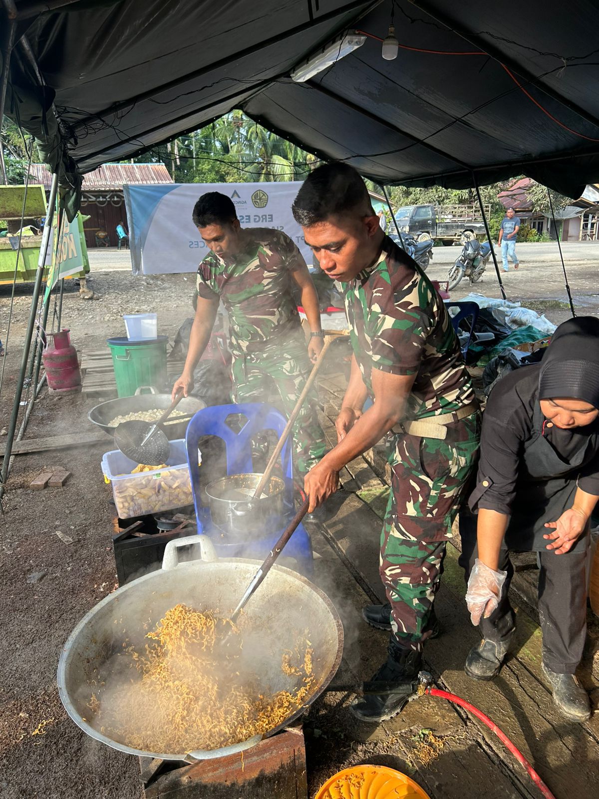 Personel Satgas Penanggulangan Bencana Alam bersama warga dan relawan terlibat langsung dalam penyiapan bahan hingga proses pemasakan makanan di dapur umum. Makanan yang telah siap kemudian dibagikan kepada para pengungsi sebagai bagian dari pelayanan dasar selama masa tanggap darurat bencana.