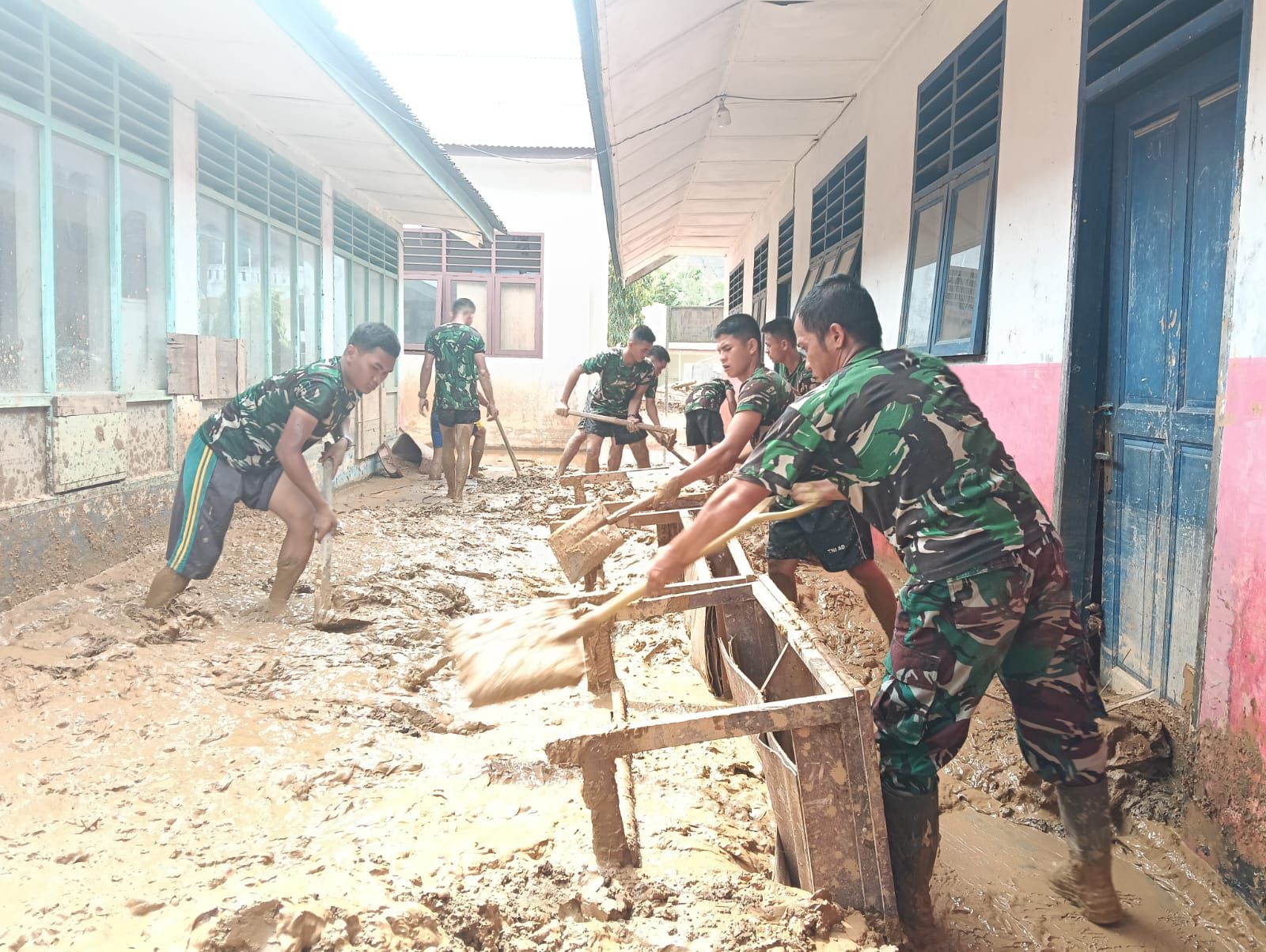 Kegiatan pembersihan tersebut difokuskan, Minggu (28/120 pada pengangkatan material tanah dan lumpur yang masuk ke dalam ruangan serta bangunan sekolah akibat banjir, sehingga menghambat aktivitas belajar mengajar.