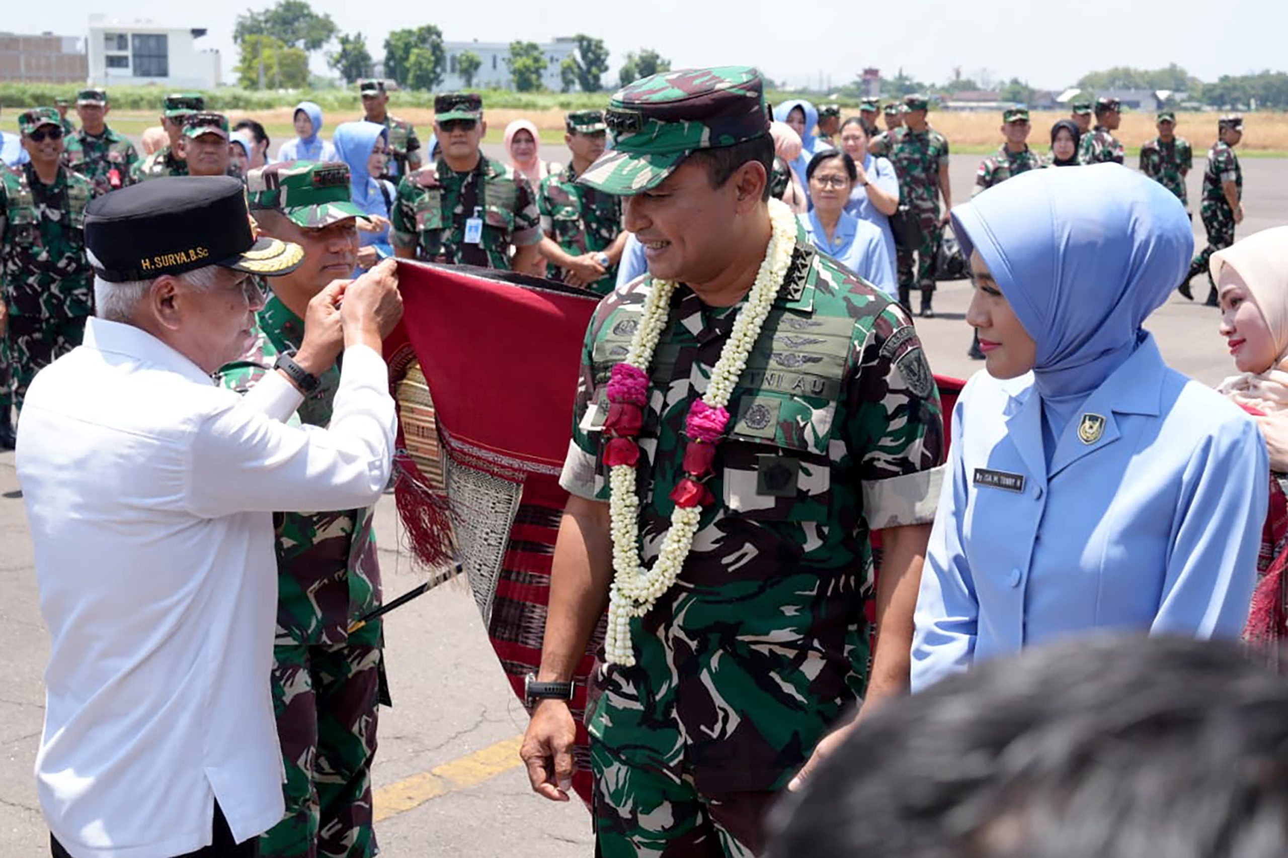 Diiringi tarian selamat datang, Wagub Sumut Surya bersama Ketua DPRD Sumut Erni Ariyanti mengulosi Marsekal TNI M Tonny Harjono dan Ketua Umum PIA Ardhya Garini Isa M Tonny Harjono.